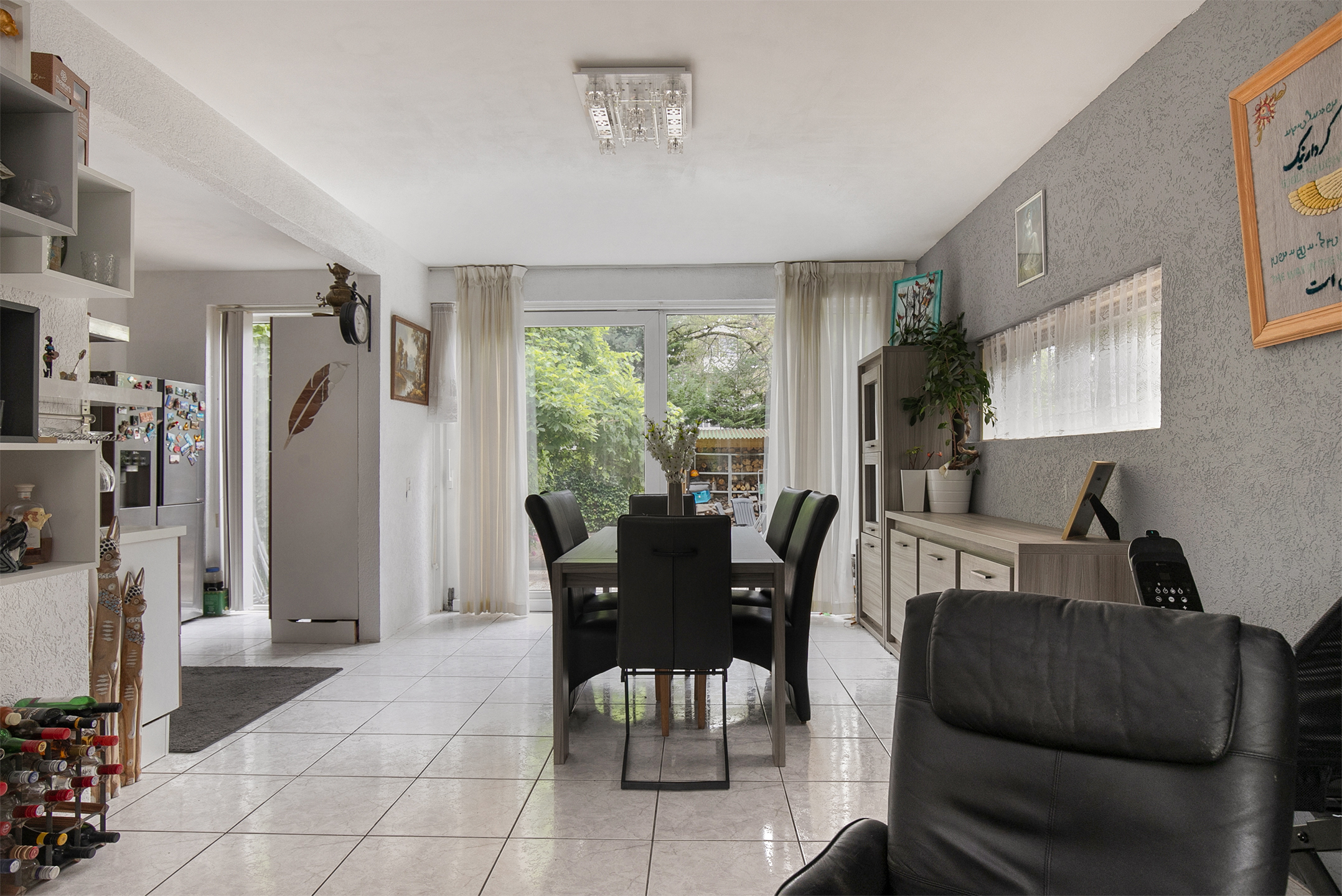 De woning beschikt over een ruime achtertuin die grotendeels betegeld is. Aan weerszijden vind je veel groen en volwassen bomen, waardoor je kunt genieten van privacy en een groene omgeving.